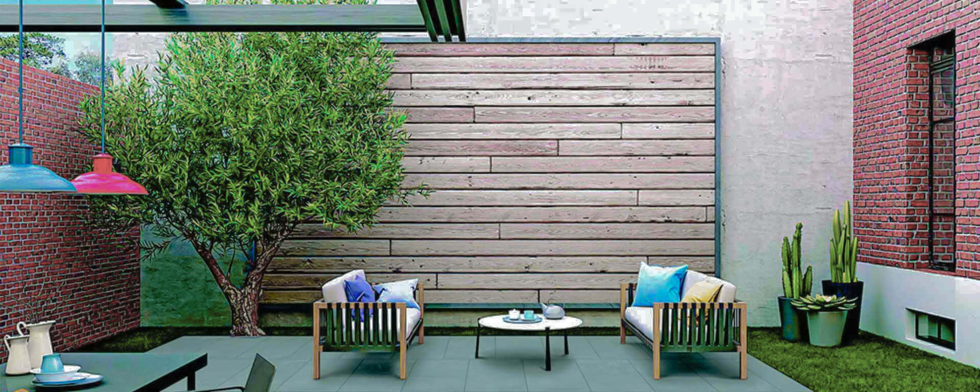 • Otra buena opción son las plaquetas decorativas que imitan la pizarra, el mármol o la madera, y te pueden servir para crear diferentes espacios (zona chill out, zona barbacoa, etc.) y combinarlas con paredes lisas, por ejemplo.